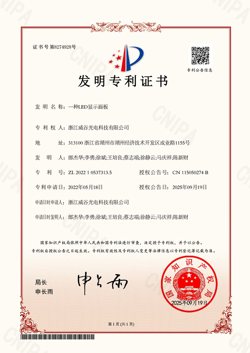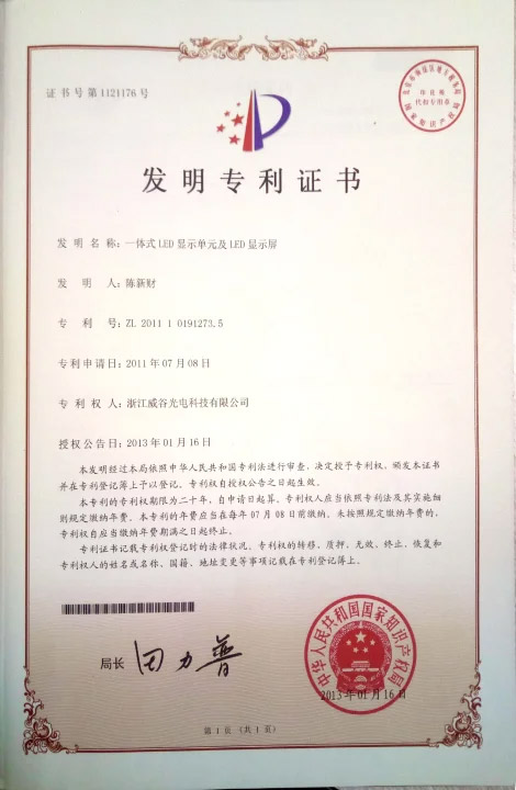 Honor Patent 一种LED显示面板 一体式LED显示单元及显示屏 一种用于LED显示屏的前维护锁具 一种用于LED显示屏的插接面板 一种基于LED显示面板的显示屏安装结构 一种单元屏体的单元拼接件 一种LED显示屏显示时的亮度调节系统 一种LED显示面板的显示组件安装结构 一种LED显示面板 KG202224876威谷美国发明证书 一种基于LED显示面板的显示屏安装方法 一种便于维护的显示屏 一种用于显示屏搬运的伸缩把手及显示屏 发明专利证书-2019112271632-一种标准化模条显示屏 发明专利:一种基于LED显示 面板的显示屏安装方法 一种用于模条显示屏的框体结构及模条显示屏 45 records 123 >